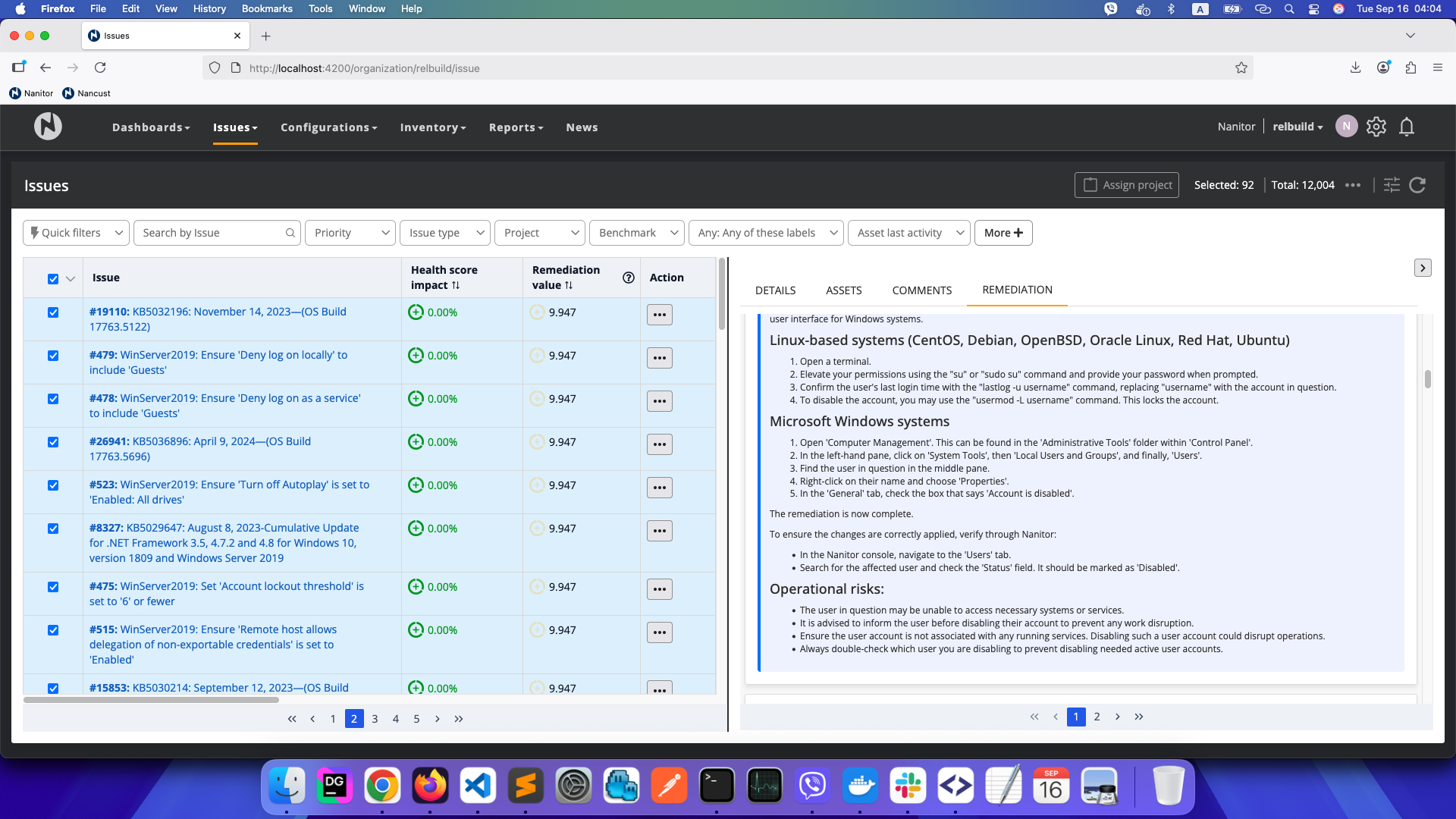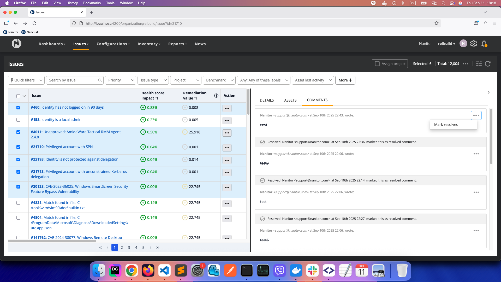 Split-panel quality suite for faster triage. The Issues split panel now remembers your active tab when you hop between issues, re-opens reliably after closing, shows the same high-value fields you’d find on the full issue page (CVSS3, KEV/EPSS, summaries), and the Assets tab lets you expand each host to see exactly which selected issues apply plus OS context inline.