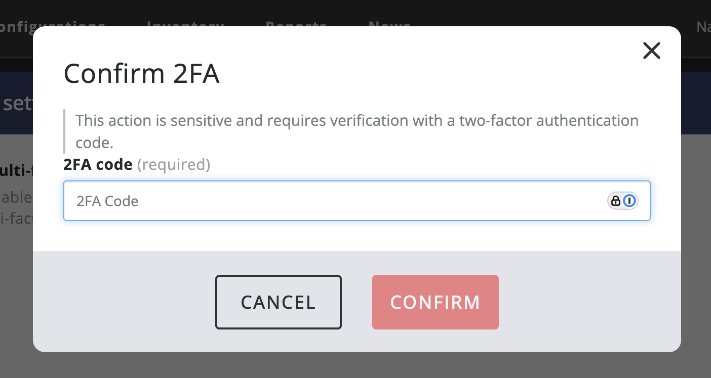 Step-up 2FA for sensitive admin actions. System Admins are prompted for a current 2FA code before high-impact operations (for example, turning off Force 2FA or resetting another user's 2FA). Actions are logged.