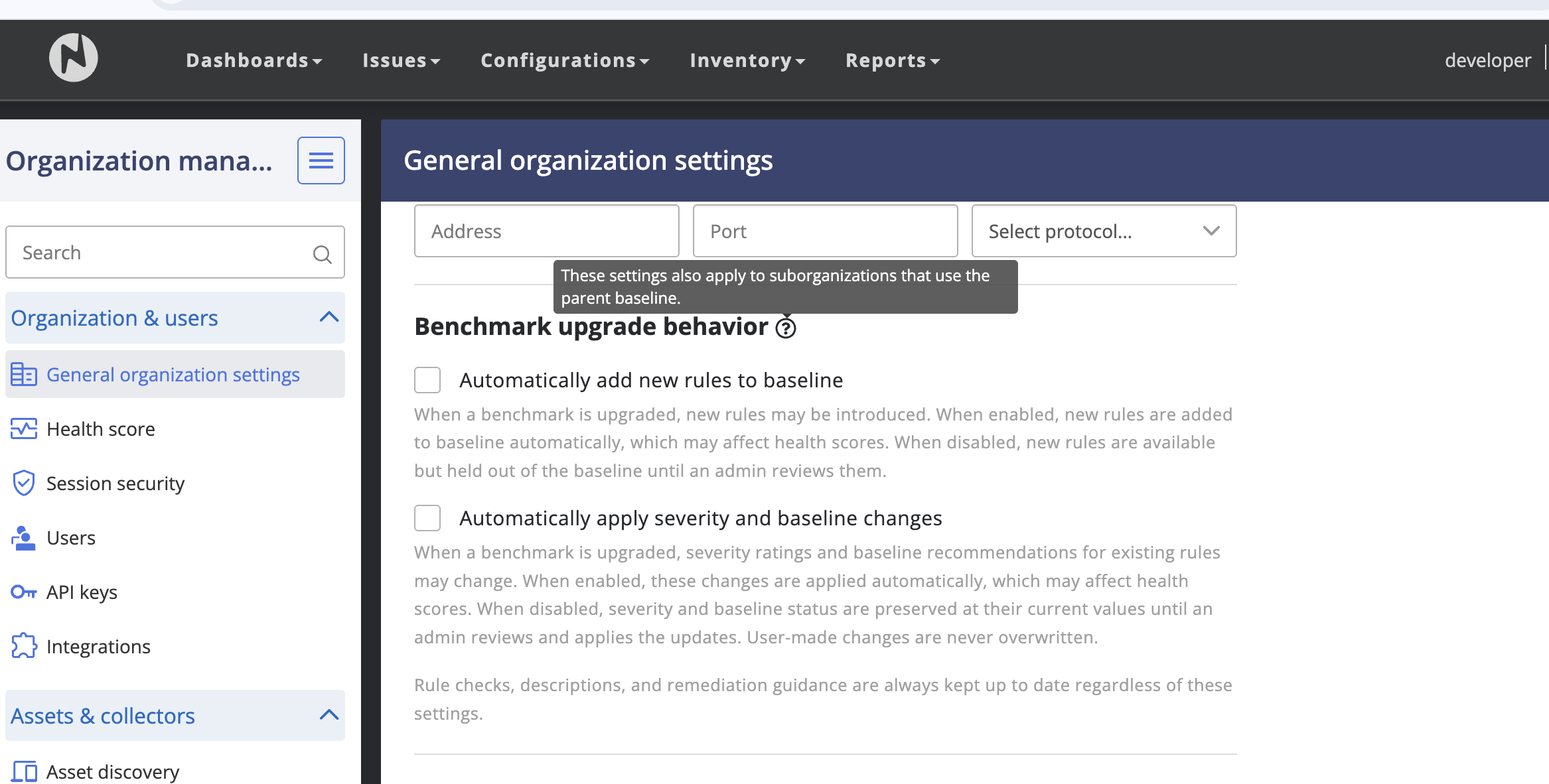 In previous versions, benchmark upgrades automatically added new rules to baselines and applied severity changes. Starting with v7.0.0, these are held by default until an administrator explicitly applies them. If you rely on automatic baseline updates, enable these settings after upgrading.
