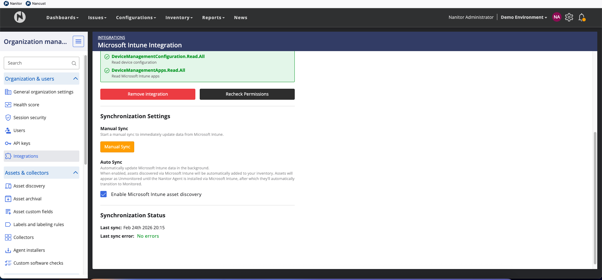 Unified Asset Discovery: Automatically discover and import devices managed in Intune. Nanitor uses a matching priority — Serial Number, Azure AD Device ID, MAC address, and Hostname — to ensure that devices with both an Intune presence and a Nanitor agent are merged into a single record, preventing duplicates. Synchronization runs every 24 hours with manual sync available on-demand. Asset discovery from Intune can be enabled or disabled per organization.