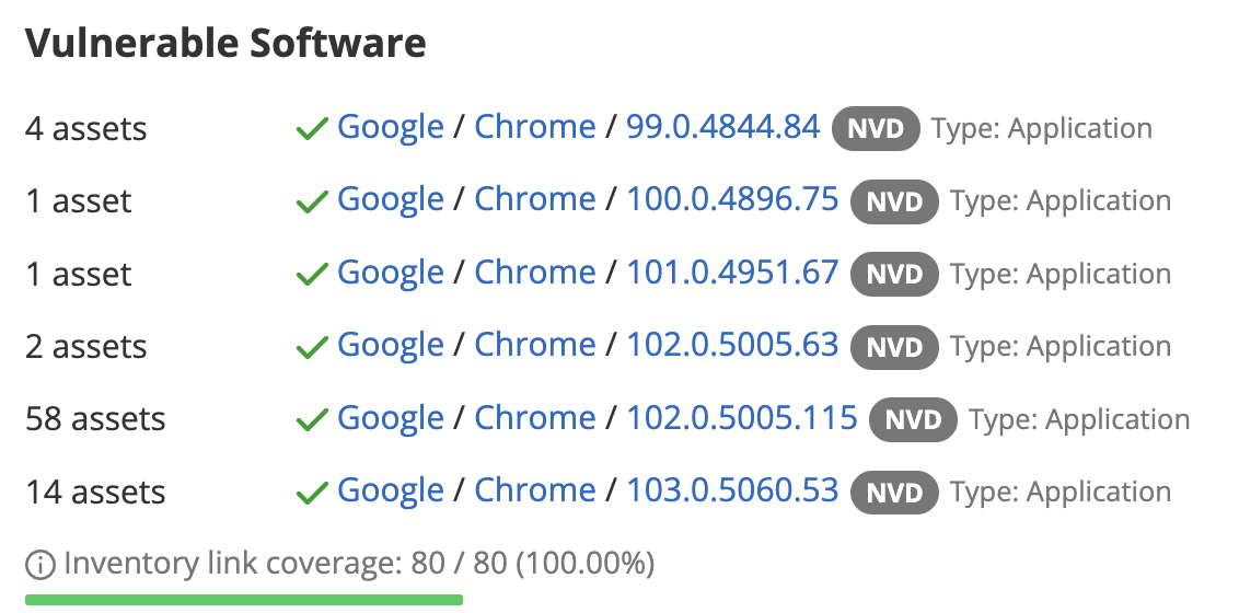 Inventory link coverage is shown as a progress bar (e.g., "80 / 80 devices — 100%"), giving you a quick read on how well detections are connected to your software inventory for that issue.
